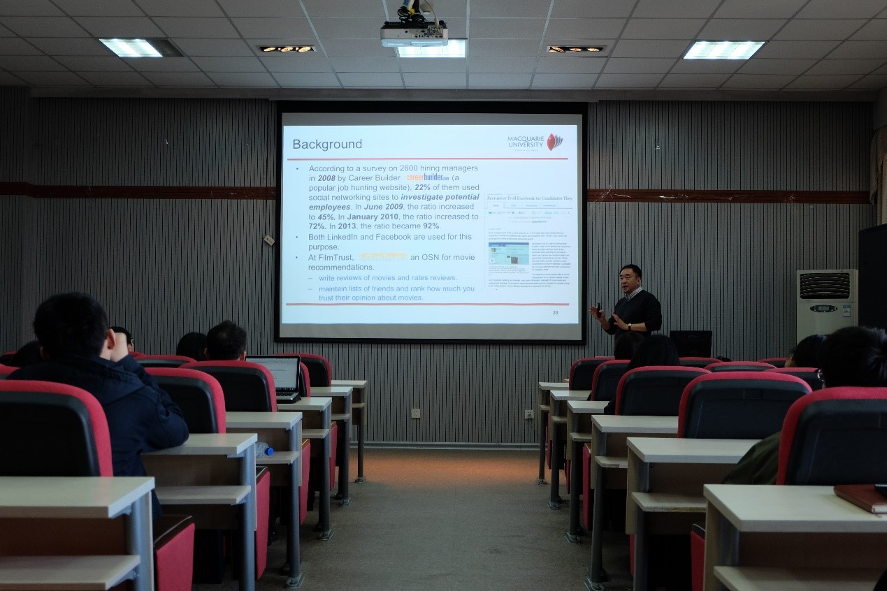 做了题目为“Trust Management in Social Networks and E-Commerce Applications”的学术报告。王岩是澳大利亚Macquarie大学计算机系副教授,于哈工大获得博士学位,曾在新加坡国立大学进行博士后研究工作。目前是澳大利亚 Macquarie大学计算机系的副教授,并主管研究生事务 (HDR Director), 也担任哈尔滨工业大学的客座教授,主要从事可信计算,社会网络,服务计算,和推荐系统等方面的研究。王岩副教授目前是IEEE Trans. on Services Computing (TSC), 和Springer关于服务计算和社会网络的两个国际期刊的编委。曾担任多个国际会议的大会主席或程序委员会主席。近年来论文主要发表在AAAI, AAMAS, IEEE SCC, IEEE ICWS, ICSOC等会议, 和 IEEE Trans. on Services Computing (TSC), IEEE Trans. on Knowledge and Data Engineering (TKDE), 和ACM Trans. on the Web (TEB)等期刊上。王岩副教授曾获得2010年Macquarie大学17吃瓜网