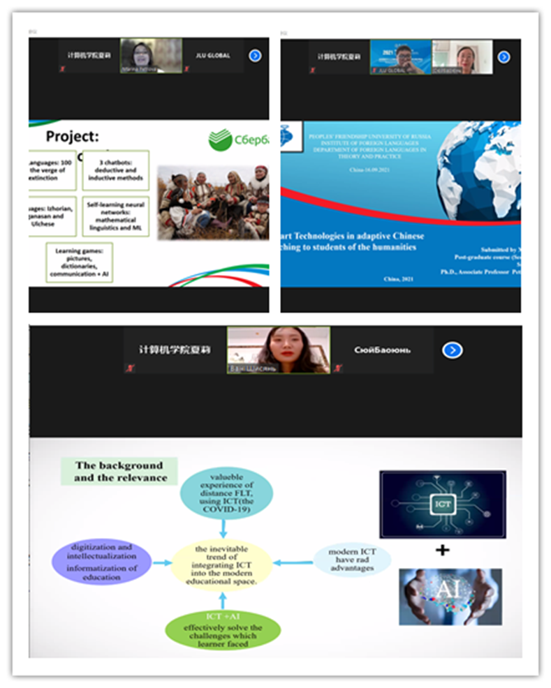 正元创新中心科学家孙林红高级研究员,俄罗斯人民友谊大学Marina Petrova教授,Baoyun XU博士,Shixian WANG博士等做了精彩的学术报告。报告讲座主题包括“How to Balance Teaching, Research, Service, (and Administration)”,“Privacy Preserving Computation Offloading for Time-Series Activities Classification in eHealthcare”,“Towards post pandemic era: empirical decision-making system for autonomous vehicles”,“企业人工智能应用思考与实践”,“后疫情时代人工智能技术在产学研用中的机遇与挑战:信息安全之人工智能”,“Creating an Individual Educational Trajectory of Students in AI conditions”,“Smart Technologies in adaptive Chinese teaching to students of the humanities”,“Information and communication technologies with elements of artificial intelligence in foreign language teaching at a university”。讲座主要针对后疫情时代的AI应用,从学术界和工业界的角度,围绕计算机领域前沿展开讨论。参会人员对每场讲座都抱有极高的热情,学术交流氛围浓厚。