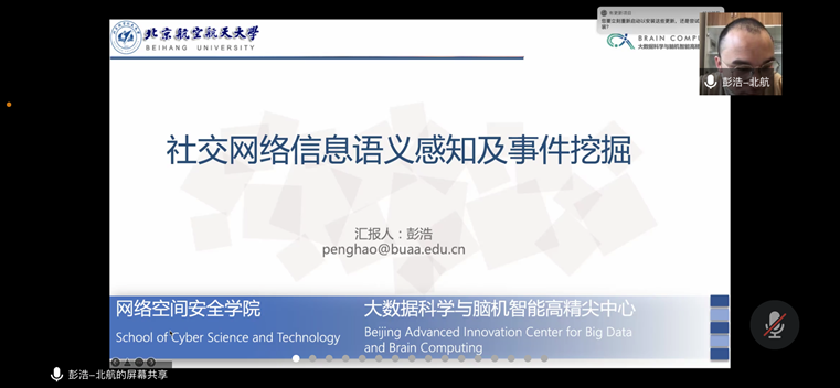 在本次报告中,彭浩老师面向社会网络信息空间大数据,由浅入深地介绍了在社交网络数据语义表征计算和社会事件检测方面的研究和系统进展,内容涵盖了增量表示学习、社会事件建模、小样本事件检测、强化图神经网络、增强流式密度聚类等方面关键技术。最后,彭老师悉心地回答老师和同学们的提问,受到了广大师生的热烈响应。