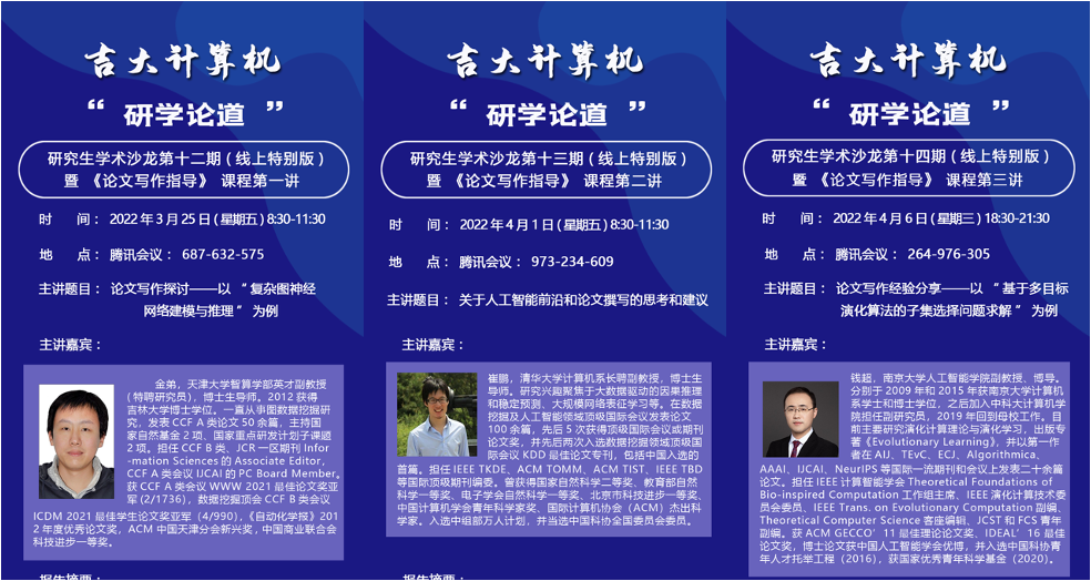 已经陆续邀请了天津大学的金弟副教授、清华大学的崔鹏副教授以及南京大学的钱超副教授分别给我们带来了图神经网络、人工智能发展趋势以及子集选择等方面的学术讲座,同时三位老师也向我们分享了在论文写作方面的心得。两院学生在每期的学术报告中都受益匪浅,同时这也为我们今后的学习科研存续力量!