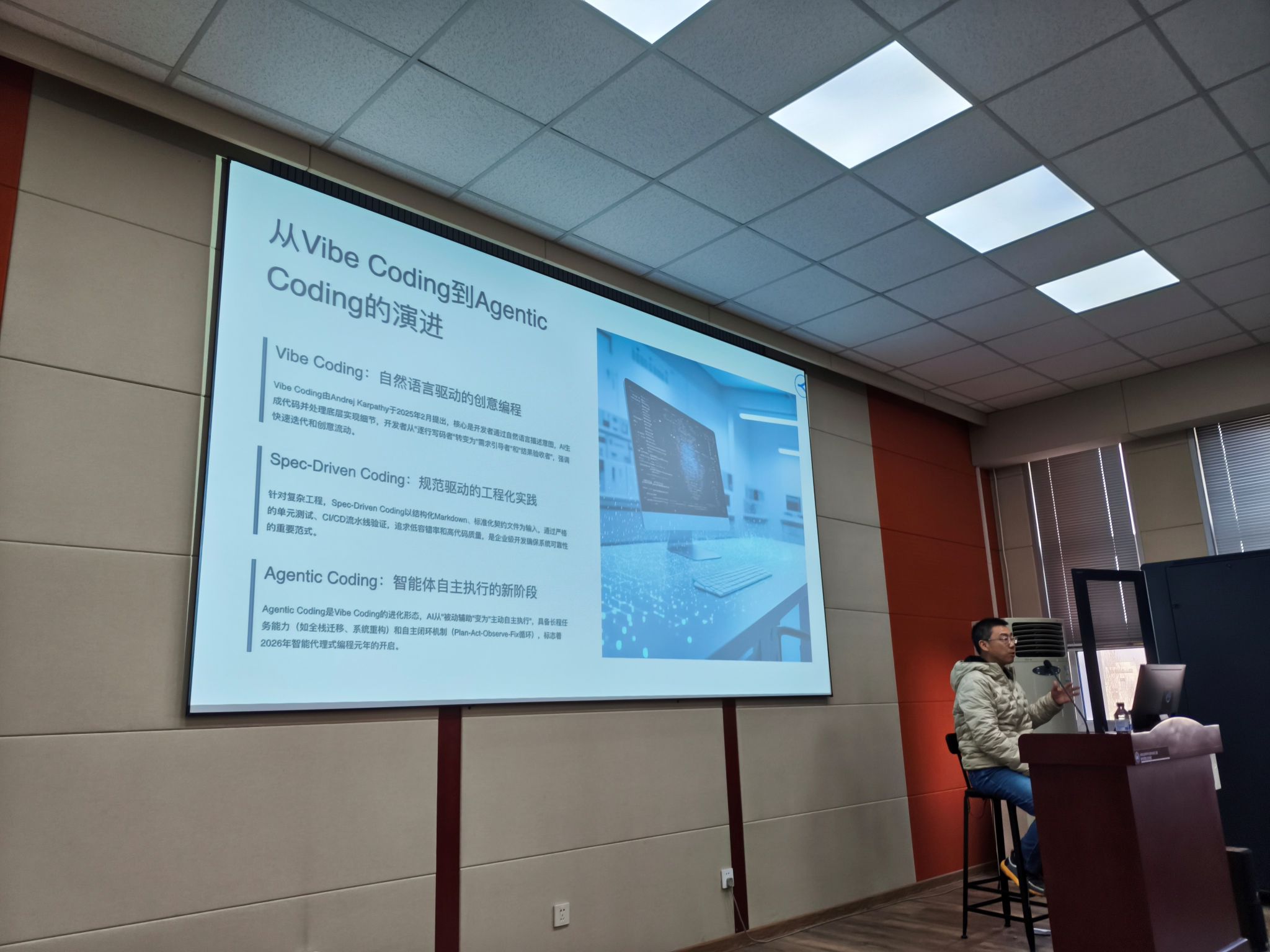 在报告中,陈滢博士围绕人工智能驱动的软件开发新范式展开深入讲解,系统梳理了AI辅助编程的发展脉络与核心逻辑。他指出,随着大模型能力的持续提升,AI已从早期的代码补全工具,逐步演进为能够理解开发需求、拆解复杂任务、调用多种工具并进行自动纠错的“编程智能体”,软件开发正迈入“Agentic Coding”的新阶段。在此背景下,陈滢重点介绍了Vibe Coding与Spec-Driven Coding,结合具体案例对其在实际开发场景中的应用方式与优势进行了展示。
