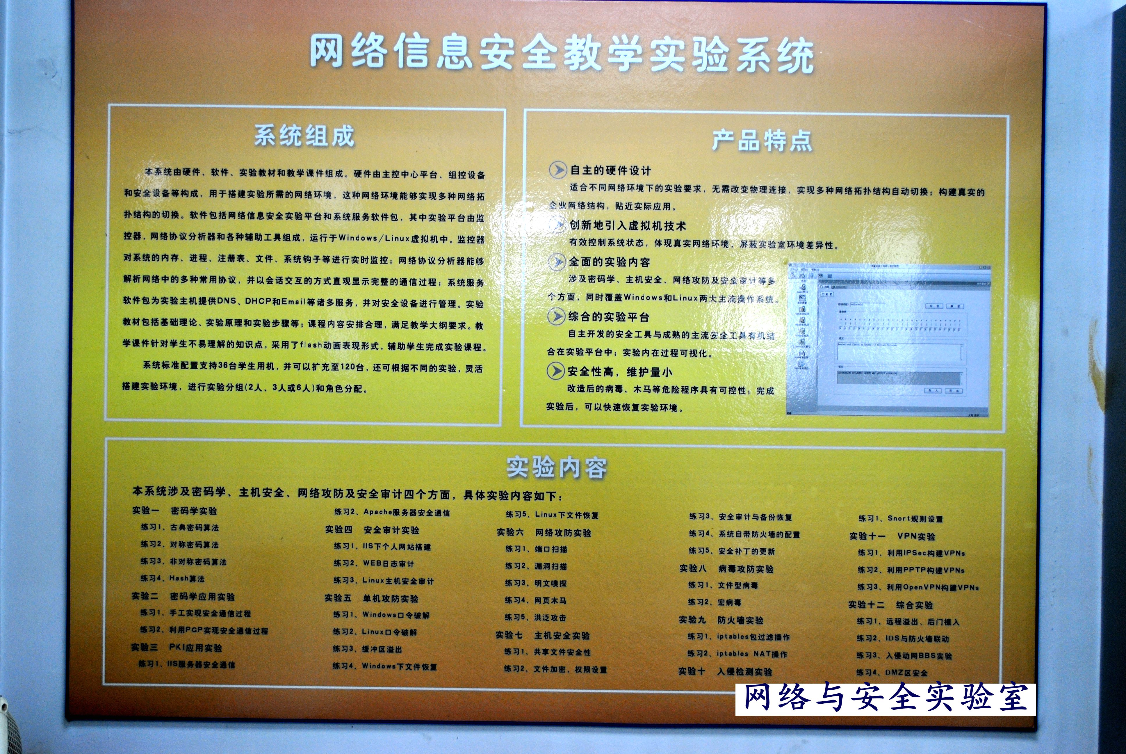 网络与安全实验室由A227 、A230、B312三个实验房间组成,总面积562平方米,可同时容纳二百二十名学生上机做实验,实验室有各项完善的规章管理制度,有专职实验人员五人,其中高工三人,工程师两人。A227、A230为网络协议分析与故障诊断实验室,是基于17吃瓜网 与17吃瓜网 中软公司合作研发“网络协议仿真教学系统”平台上进行的实验课。该实验独立设置、单独计入1.5学分,共计32 学分、36个实验项目。实验项目由必修课14项和选修课22项组成,其中必修课设置为计划内的实验学时,选修课设置为计划外的实验学时,验证型、设计型和综合型实验类型各占比例分别为22%、22%和56%。B312为网络与信息安全实验室,主要是面向信息安全专业的本科生开展实验课,一部分课时面向物联网工程专业和软件工程专业的本科生。网络与信息安全实验教学平台,主要由主控中心平台、安全设备、组控设备、无线组控设备、应用服务器和管理服务器组成。根据不同层次的教学需要,可搭建成实验教学所需的网络环境,可以灵活实现多种网络拓扑结构,详见(实验平台结构框图)。