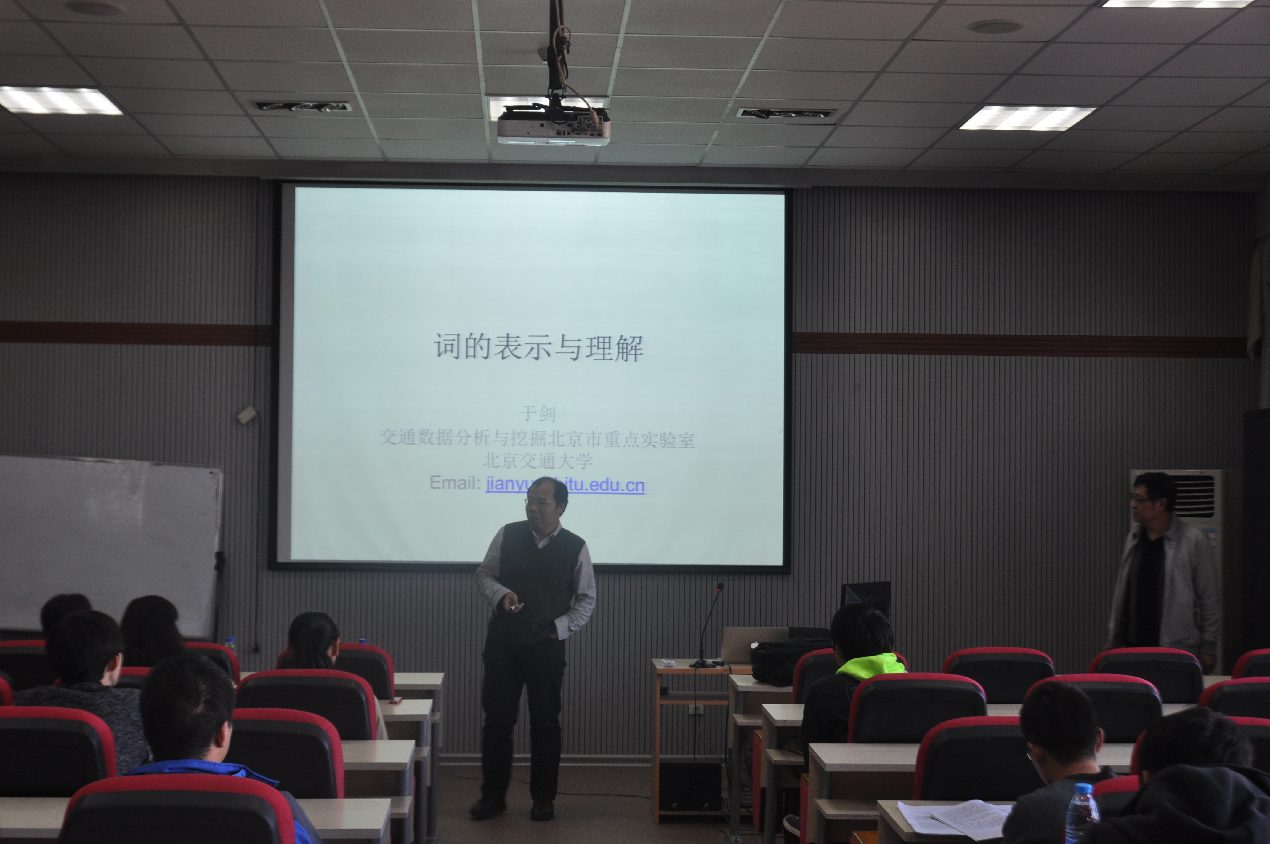于剑教授首先在报告中介绍了词是最小的独立运用的语言单位,以及词的外延语义和主观语义,并结合生活中实际的例子指出了词的经典表示中的缺憾,既不能满足计算机处理词的需要,也与人们使用词的日常方式存在重大差别。随后,于剑教授从语义角度给出了一个符合人类认知习惯的全新词表示方式,定义了词的内名和外名,内蕴指称和外部指称,给出了词表示的自一致性假设,由此定义了概念系统,对话双方彼此理解的条件。并利用上述结果,分析了违反词自一致性和对话条件所导致的各种常见笑话。在报告的最后,于教授与在场的师生进行了热烈的讨论。