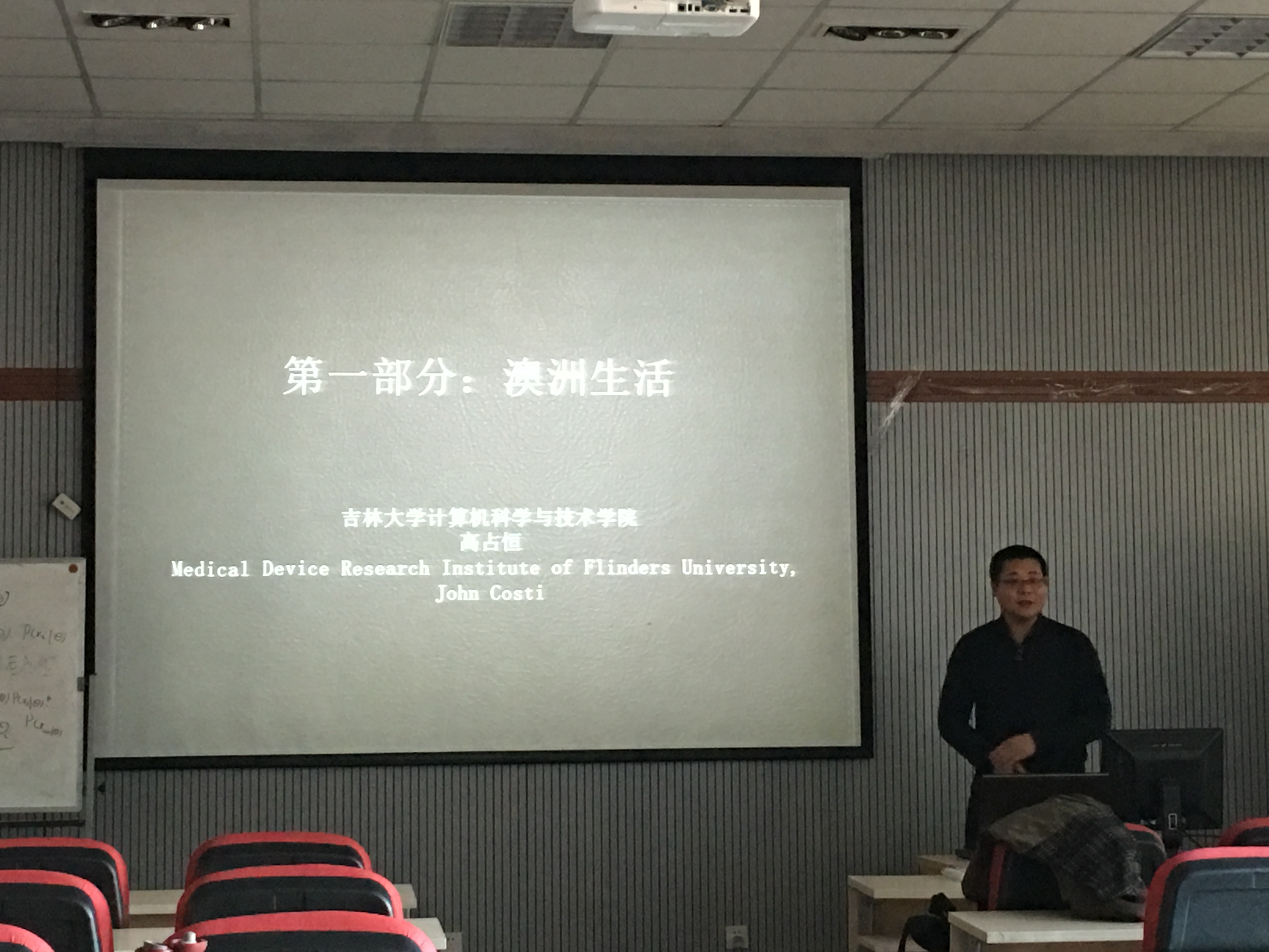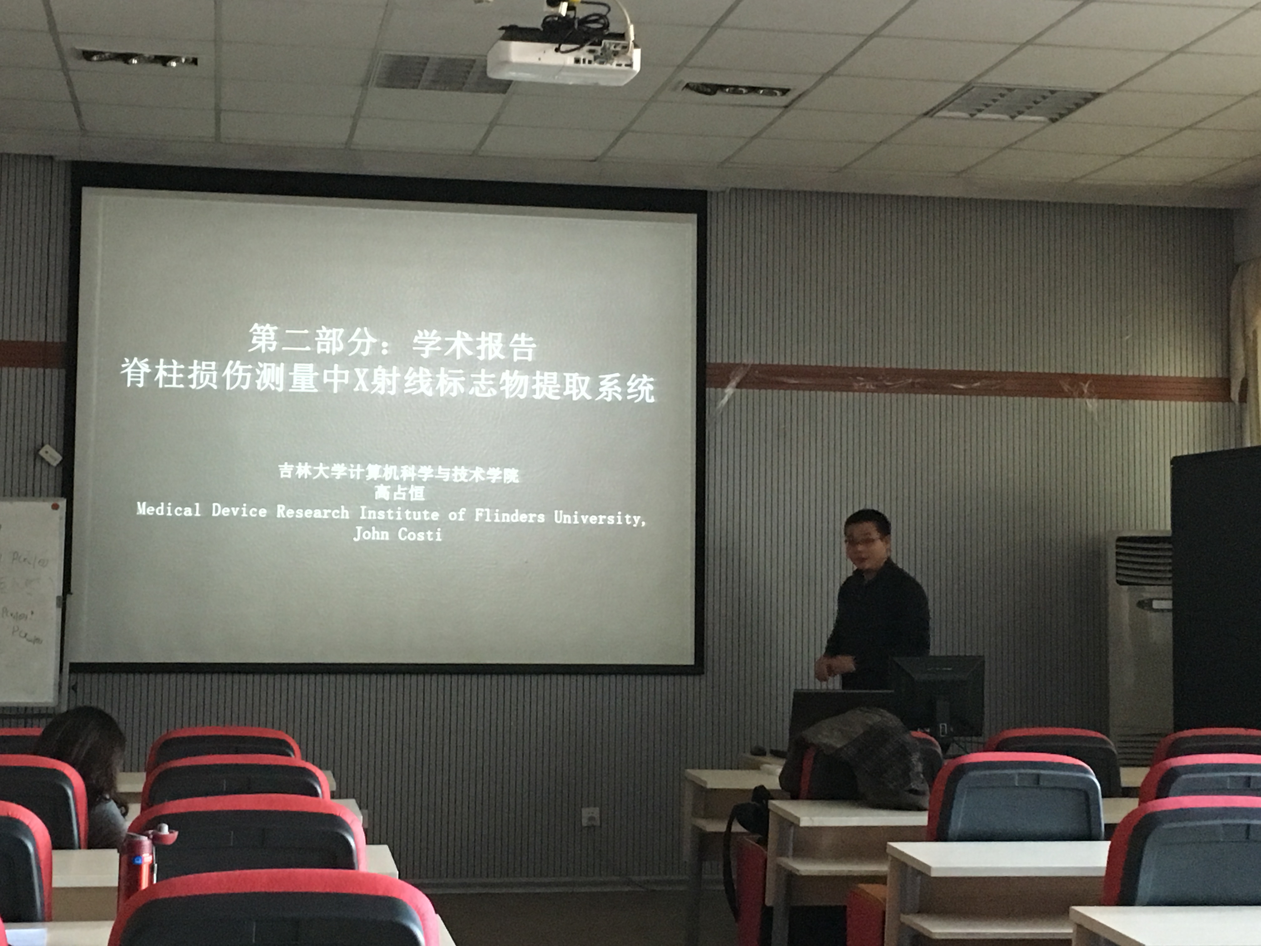做了题目为“脊柱损伤测量中X射线标志物提取系统”的学术报告。报告主要介绍了高占恒副教授在澳大利亚从事访问学者期间,取得的一系列关于脊柱损伤测量中X射线标志物数字化的研究结果。报告中,高占恒副教授首先介绍了澳大利亚的工作、生活情况,然后介绍了脊柱损伤问题的定义、目前解决方案、本人在访学期间做的工作,着重介绍了其在访学期间研发的一款半自动X射线标志物数字化软件WireDig,包括软件的功能、特点,以及与原有软件相比的优势。