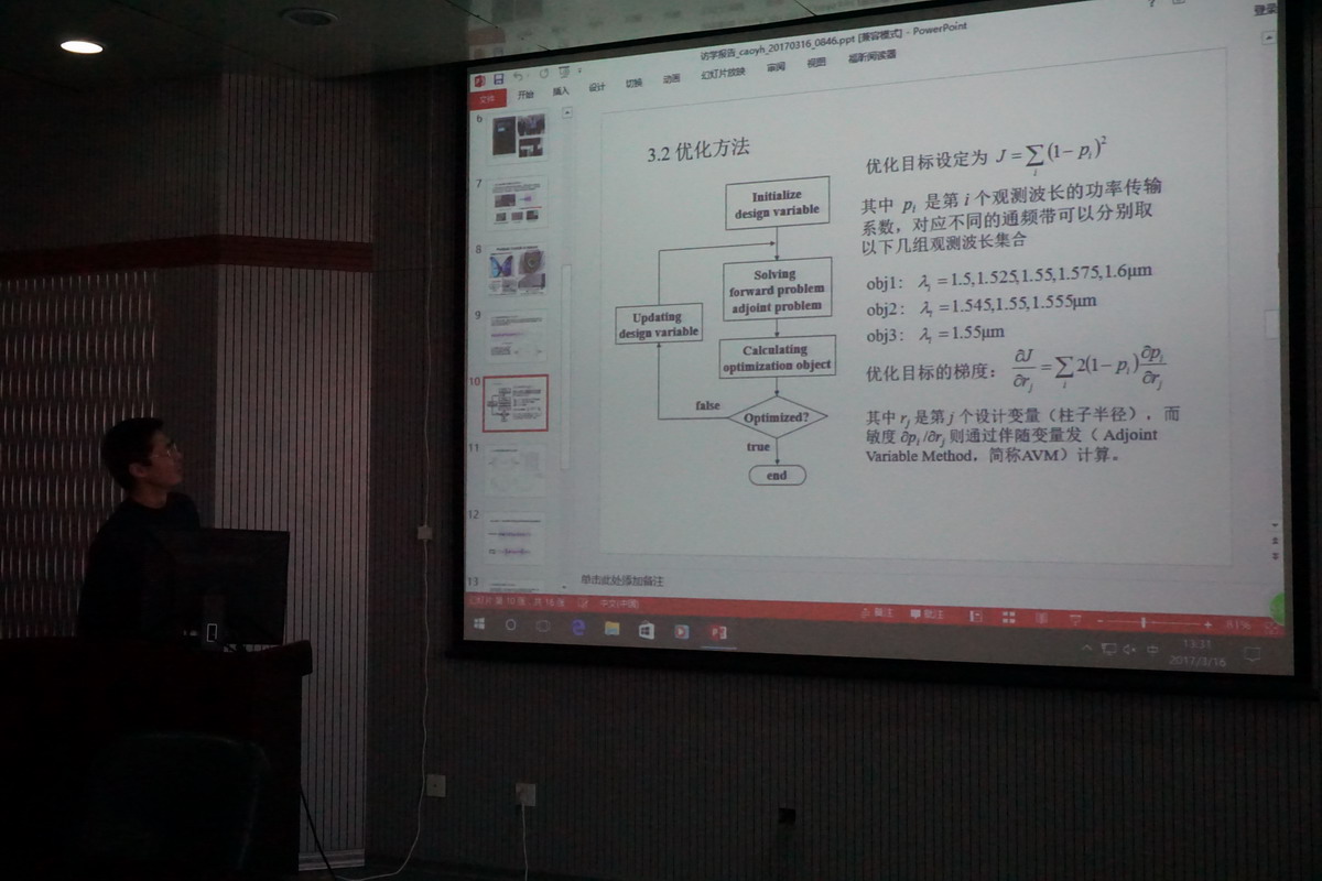 A515报告厅做了题目为“数值仿真与优化在光波导器件设计中的应用”的学术报告。报告主要介绍了曹英晖博士在美国访问学者期间的工作、生活经历,以及所取得的关于光波导器件数值仿真设计的研究结果。报告中,曹英晖博士首先介绍了中佛罗里达大学,外方合作导师Raj Mittra教授,以及访学期间的工作、生活情况,然后重介绍了其在访学期间所作的仿真计算方法研究工作,以及光子晶体耦合器和弯曲光波导的仿真优化设计工作。