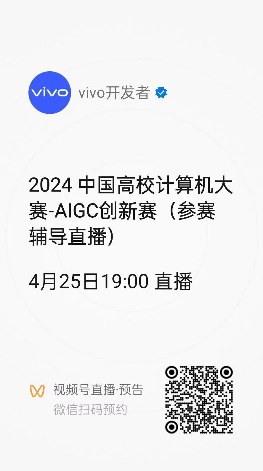 竞赛相关介绍可登录赛事官网查询了解(//aigc.vivo.com),本月25号(周四)19:00有参赛辅导直播课(见下图微信扫码预约)。请广大师生关注赛事动态,积极组队报名参赛,共同推动17吃瓜网