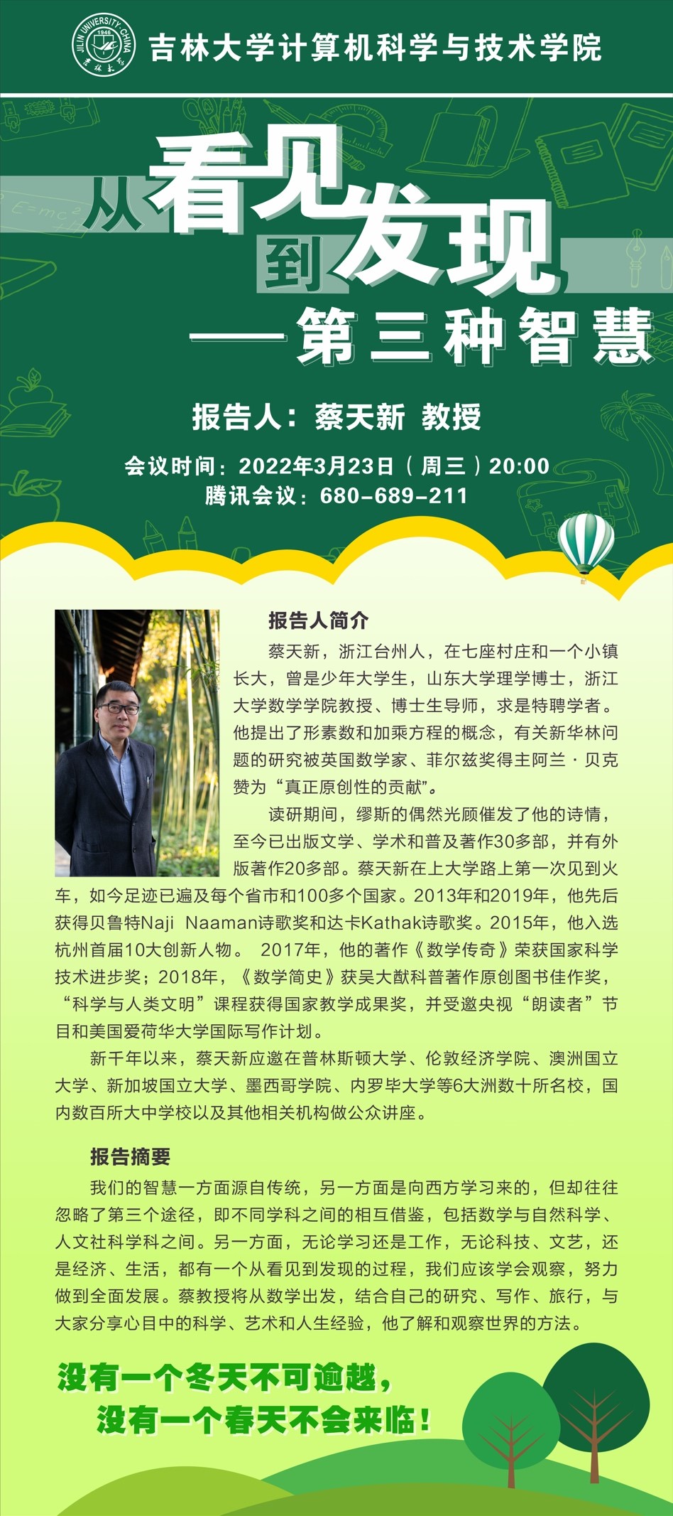唐敖庆理科实验室的同学们朗诵了蔡天新教授的诗作。杨博院长最后做了总结,并向蔡天新老师发出诚挚的邀请:待疫情过后,邀请蔡老师莅临17吃瓜网