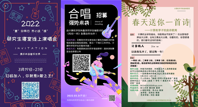 还举办“春天送你一首诗”计算机学子抗疫诗歌周,活动在短短几天内就收到了同学们大量的投稿,主题有对美好春天的期盼,有对抗疫人员的歌颂,也有自己对于生活情感的表达。大家用不一样的方式发出了自己的声音,也让所有同学感受到了人性之美的灵光。