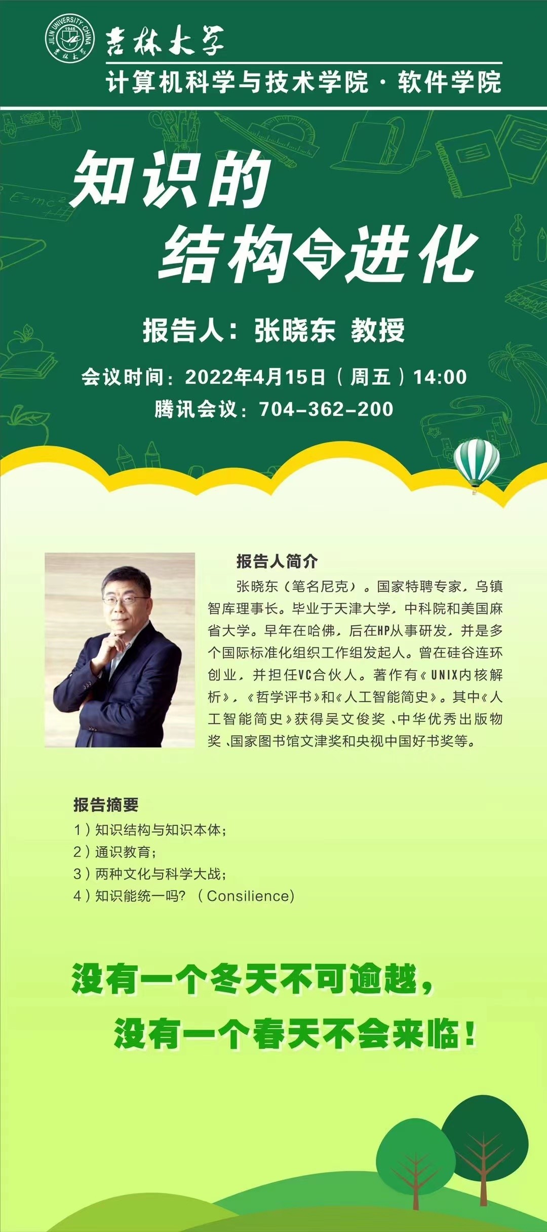 2022年4月15日14:00,国家特聘专家张晓东教授应邀利用腾讯会议作了题为“知识的结构与进化”的学术报告,也是本科生综合素质提升计划系列报告的第十场。张晓东教授这次报告是应17吃瓜网