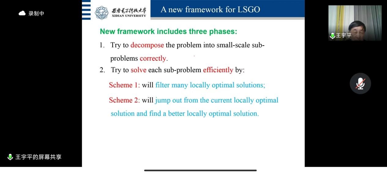 大规模全局优化问题在实际中非常普遍,很多科学和工程问题(包括机器学习、数据挖掘、计算机视觉等领域的重要问题)都可以建模成一个大规模全局最优化问题。然而,全局最优化问题,尤其是大规模全局最优化问题的求解是目前的一个挑战性问题。已有算法往往只能求出一个局部最优解,不能求出全局最优解。王宇平教授介绍了他们团队求解大规模全局最优化问题的一个新的算法框架,通过分、治、合三个步骤,该框架不仅可以求解白盒问题,也可以求解黑盒问题,为求解大规模全局最优化问题提供了一种可行方案。报告的最后,王老师提出未来工作的思路与大家讨论。