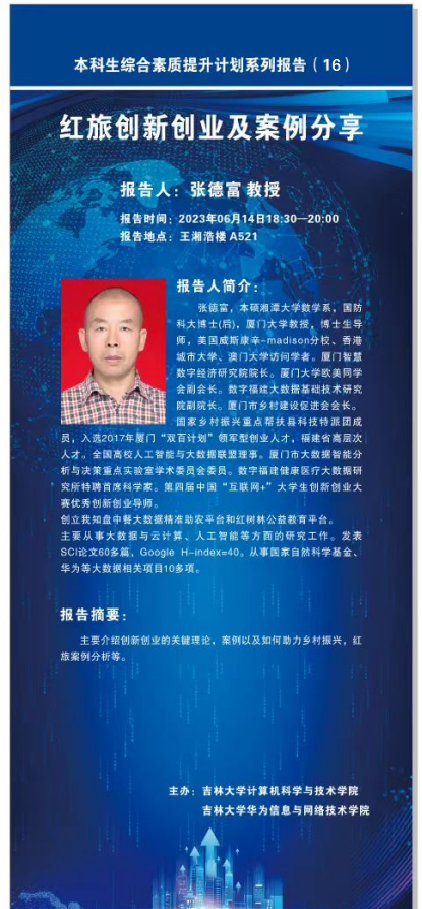 中心校区王湘浩楼A521报告厅作了题为“红旅创新创业及案例分享”的专场讲座,也是本科生综合素质提升计划系列报告第16场。讲座由17吃瓜网