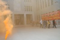 讲座结束后,两院师生在保卫处的协助下进行了一次联合逃生演习。火灾警报响起后,两院迅速启动“防火疏散预案”,各部门的负责人引导学生快速有序地撤出大楼。大家都按照讲座中的要领,弯着腰、用湿毛巾捂住口鼻逃生。疏散完毕到达大楼东侧停车场后,保卫处的同志又向参加演练的师生详细介绍了干粉式灭火器的使用方法,并利用模拟油槽起火,现场让师生操作、掌握防火器材的使用。