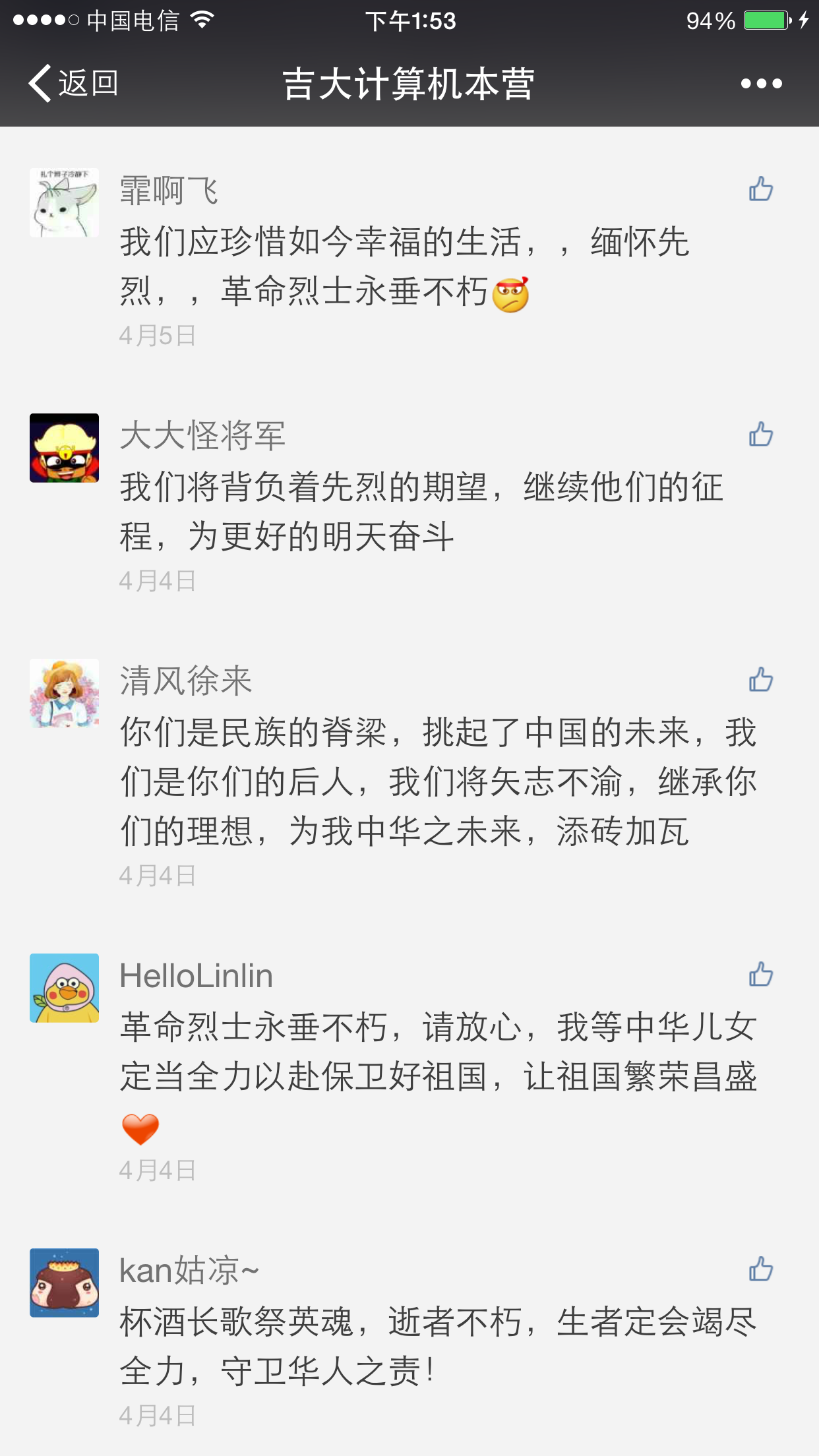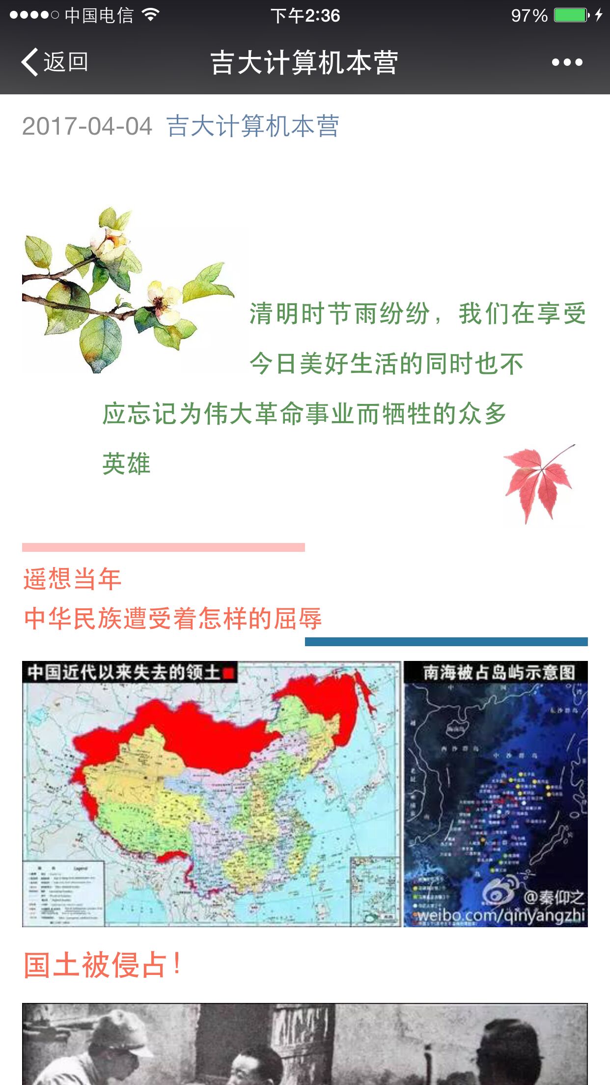 计算机本营”微信公众号上推送了一篇关于倡导清明节追悼先烈活动的文章。该文章一经发布,随即获得全校师生的广泛关注。